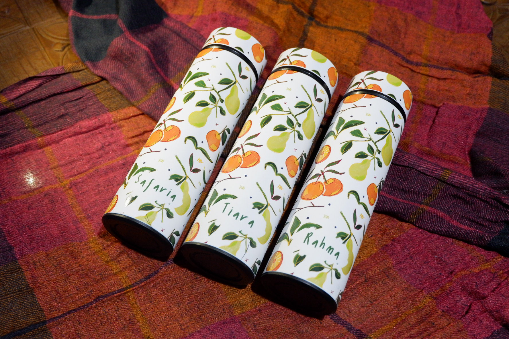 Orange and guava pattern design is applied on tumbler.